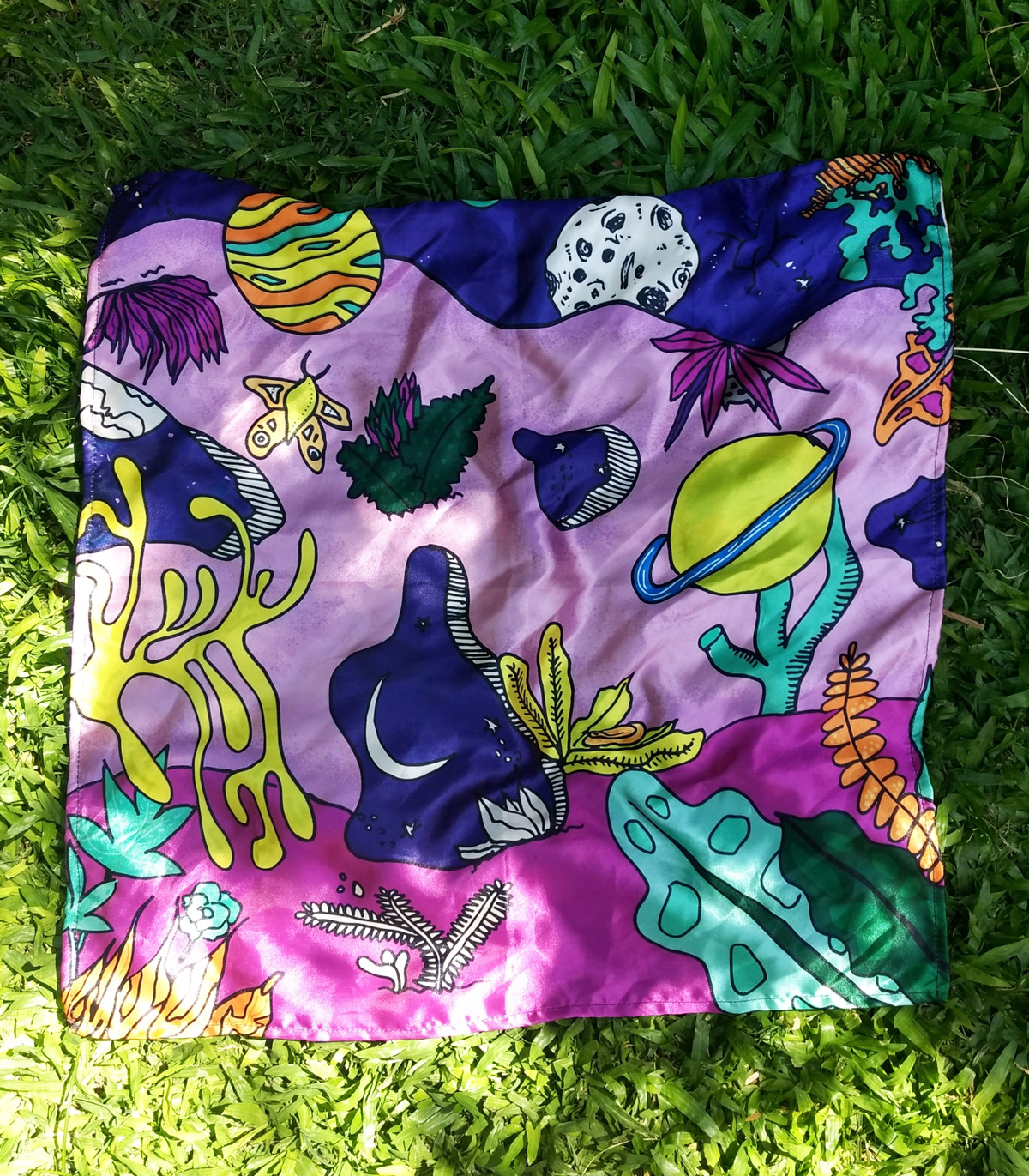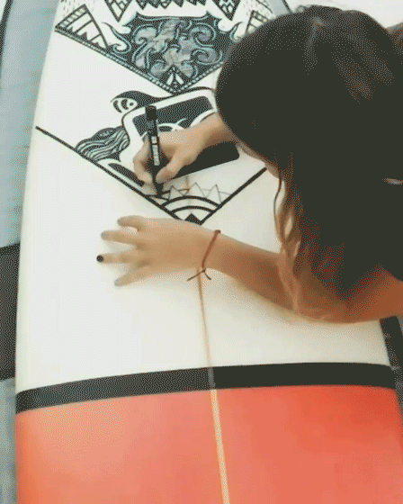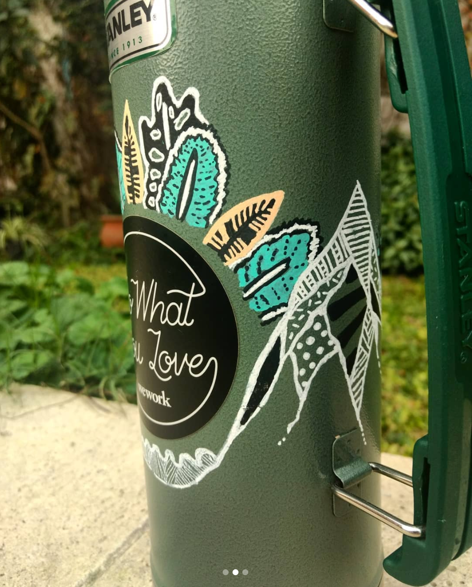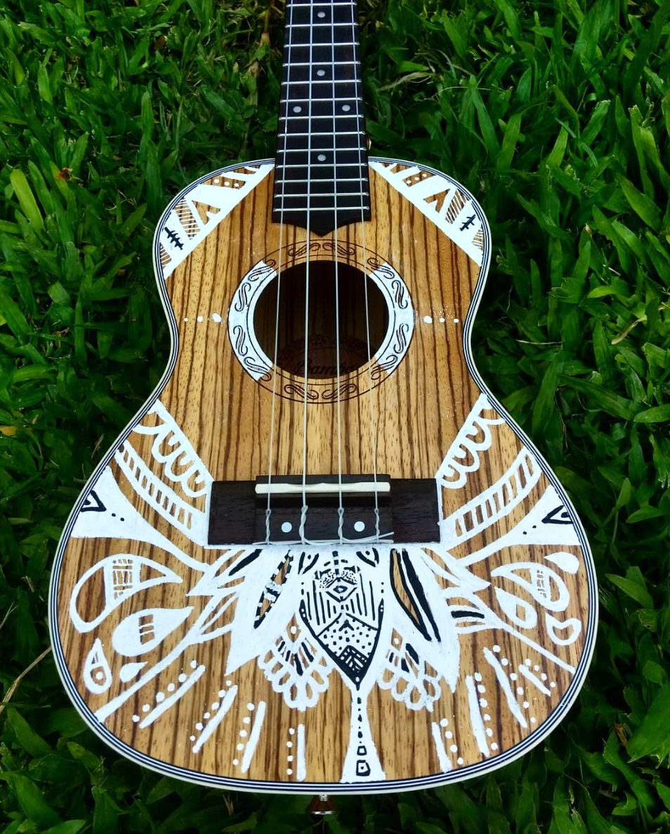 Diseño e ilustración a mano alzada, en distintas superficies como: termos, ukeleles, tabla de surf y pañuelos, realizado con fibrones Posca.